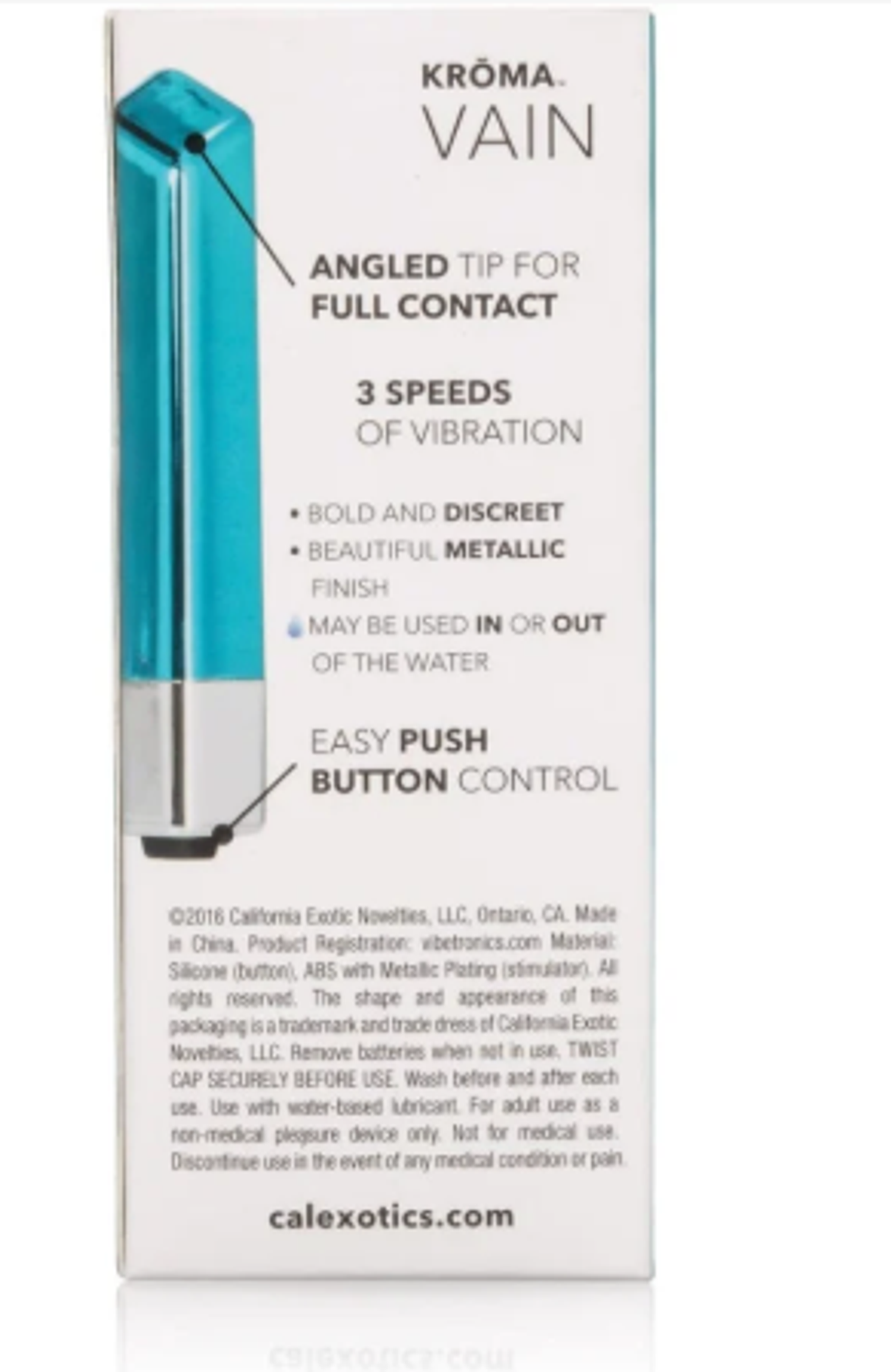 CalExotics Kroma Vain – энэ нь CalExotics брэндийн загварлаг, авсаархан, хүчтэй чичиргээтэй мини массажны хэрэгсэл юм. Түүний онцлог нь өнгөлөг металлик бүрхүүлтэй, өнцөгтэй алмаазан хэлбэрийн үзүүртэй бөгөөд энэ нь нарийн төвөгтэй мэдрэмжийг бий болгоход тусалдаг.